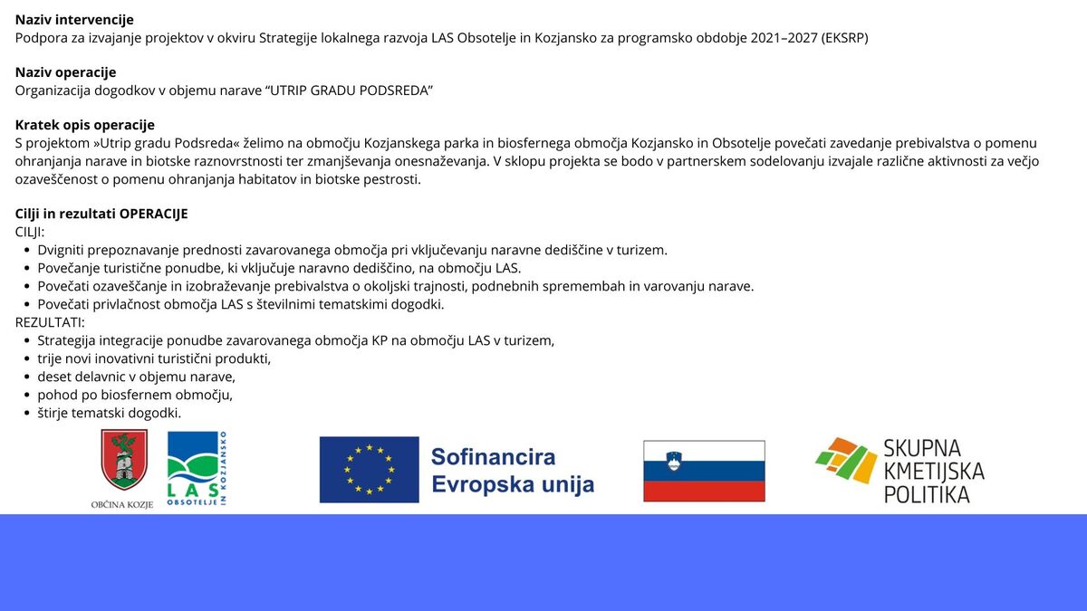 S projektom »Utrip gradu Podsreda« želimo na območju Kozjanskega parka in biosfernega območja Kozjansko in Obsotelje povečati zavedanje prebivalstva o pomenu ohranjanja narave in biotske raznovrstnosti ter zmanjševanja onesnaževanja. V sklopu projekta se bodo v partnerskem sodelovanju izvajale različne aktivnosti za večjo ozaveščenost o pomenu ohranjanja habitatov in biotske pestrosti.