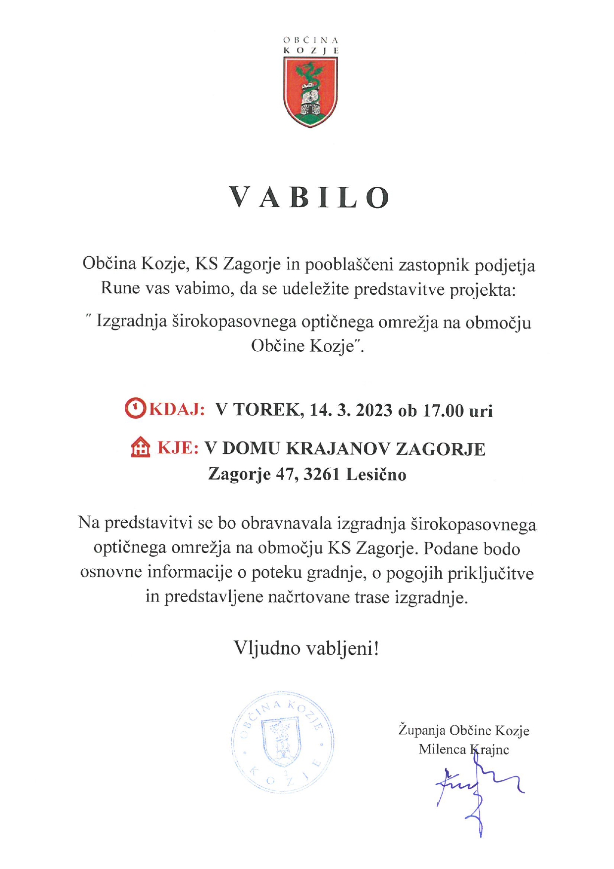 V začetku novembra preteklega leta so se na 26. redni seji Občinskega sveta Občine Kozje svetniki seznanili z načrti projekta RUNE, v okviru katerega je predvidena izgradnja ultra hitre širokopasovne infrastrukture na podeželskih območjih Slovenije. Svetniki so dobili v vpogled okvirno časovnico in predvideno traso gradnje. Seznanili so se tudi, da bodo ob priklopu uporabnikom na voljo internet, s hitrostjo večjo od 1 Gbps. In da bodo imeli uporabniki zagotovljene izjemne hitrosti interneta, ki bodo omogočale svetlobne hitrosti, s pomočjo katerih bodo hitro, zanesljivo in kakovostno brskali po internetu, nalagali vsebine, gledali televizijo ali poslušali glasbo.
